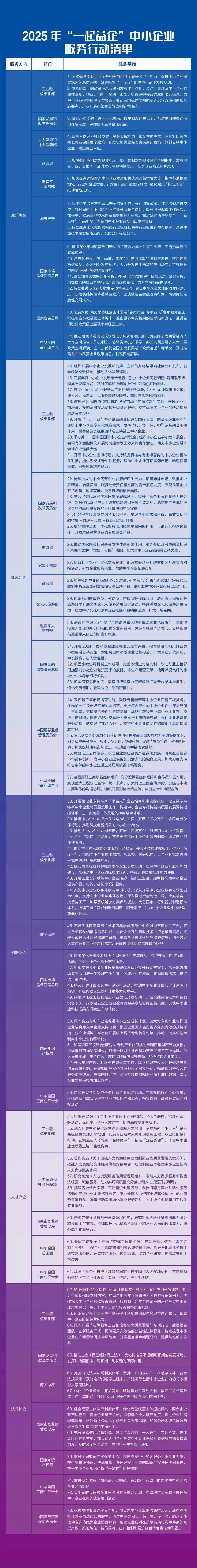 “一起益企”中小企业服务行动贯穿2025年全年,并于6月组织开展“中小企业服务月”活动。各单位要充分发挥资源优势,积极动员系统力量,结合各地实际和产业特色,按照《服务行动清单》(见附件),重点从5个方面开展服务行动。(一)政策惠企。广泛宣贯各地区各部门惠企政策,强化政策深度解读、智能推送和精准辅导,确保各类政策落地见效,提升中小企业获得感。发挥政策互联网平台作用,运用大数据、云计算、人工智能等数字技术,基于企业画像精准推送涉企政策信息。加强中小企业生产经营情况运行分析、调查研究和政策预研,推动出台更多普惠性针对性政策举措,及时帮助解决企业急难愁盼问题。(二)环境活企。加强对中小企业发展成就宣传报道,讲好中小企业故事。发挥好中小企业发展环境评估和综合督查作用,以评促优、以督促优。积极打造消费场景,加强交流合作,推动中小企业拓展市场、融入大企业产业链供应链创新链。强化跨部门跨领域数据信息共享,优化融资促进服务,提升中小企业融资便利水平。(三)创新强企。坚持专精特新发展理念,统一优质企业梯度培育,组织开展管理诊断、质量诊断、节能诊断、中试验证、检验检测和专精特新赋能等服务,促进中小企业专精特新发展。推动“政产学研用”协同创新和大中小企业融通创新,提升中小企业核心竞争力。开发推广适合中小企业特点的“小快轻准”数字化产品、服务和解决方案,推动中小企业加快数字化智能化转型。深入实施制造业卓越质量工程,持续开展质量管理能力评价。(四)人才兴企。坚持以人才为第一资源,完善人才“引育留用”机制,加强中小企业人才队伍建设。搭建多渠道产才、校企对接平台,广泛开展线上线下、形式多样的供需对接活动,助力中小企业人才引进和用工保障。加强中小企业经营管理、技术、技能人才培训,优化培训资源供给,持续提高中小企业人才职业技能和综合素质。(五)法律护企。落实《中小企业促进法》《保障中小企业款项支付条例》等法律法规,推动制修订和完善法律法规体系,建立长效机制,保护中小企业合法权益。完善中小企业诉求响应和反馈机制,形成“问题受理-办理-反馈-跟踪回访”工作闭环。开展法律宣讲、法治体检和协商调解等专项服务,引导企业加强合规管理,防范化解经营风险。(一)加强统筹,协同推进。各地中小企业主管部门要发挥牵头作用,加强与相关部门和单位协同配合,统筹制定本地实施方案,细化服务措施和任务分工。各相关部门要坚持系统观念,以本部门确定的服务行动清单内容为基础,结合行业和地方实际开展特色服务活动。(二)线上线下,联动发力。发挥中国中小企业服务网(www.chinasme.cn)和各地“一站式”中小企业综合服务平台作用,推动线上线下融合,提升服务覆盖面和精准化、便利化水平。各地中小企业公共服务机构要引领带动各类社会组织和广大市场化服务机构,优化服务供给,形成服务合力。(三)宣传推广,扩大影响。工业和信息化部及时了解各地区各部门服务开展情况、服务成效和典型案例,通过现场交流、编发简报、新闻媒体宣传报道、中国中小企业服务网开设专栏等方式加强经验交流,推动互鉴互促、共同提高。各地区各部门要加强与媒体沟通合作,及时宣传推广服务行动特色亮点,不断提高影响力,相关工作进展和经验及时报工业和信息化部(中小企业局)。工业和信息化部办公厅